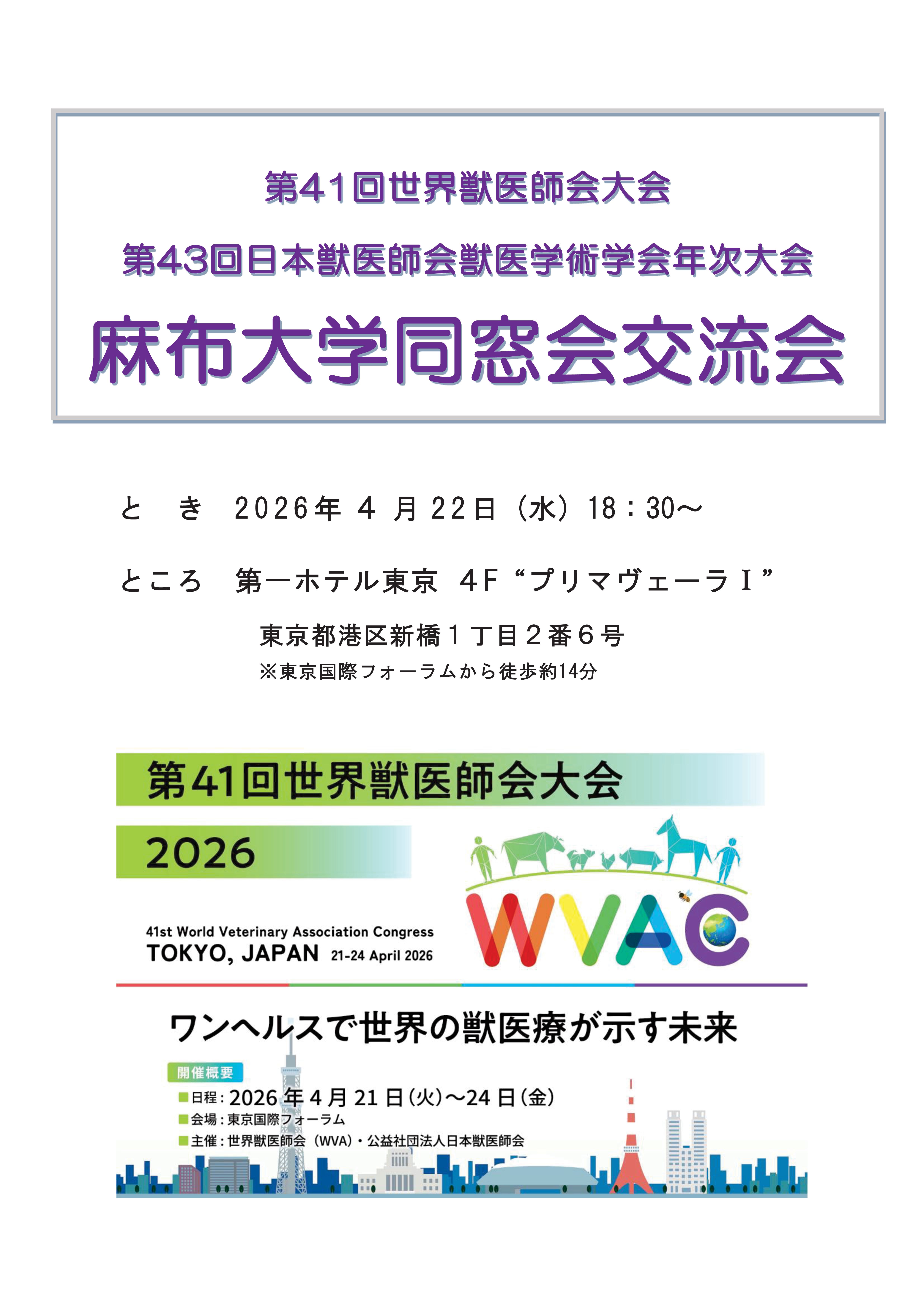 令和8年4月21日(火)から24日(金)に開催されます第41回世界獣医師会大会(https://wvac2026-tokyo.com/)・第43回日本獣医師会獣医学術学会年次大会にあわせて『麻布大学同窓会交流会』を次のとおり開催いたします。